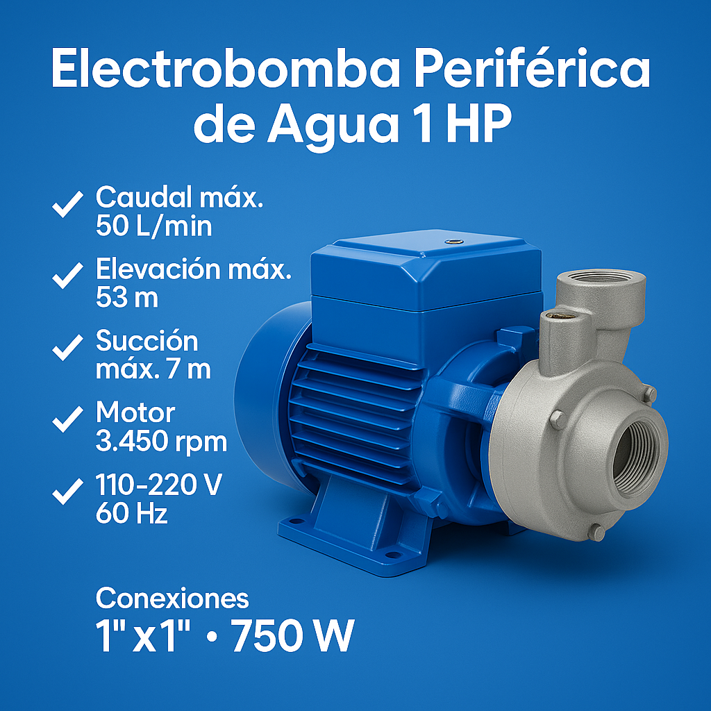 Motor y potencia: 1 HP (750 W) | 3.450 rpm | Tipo periférica para agua limpia