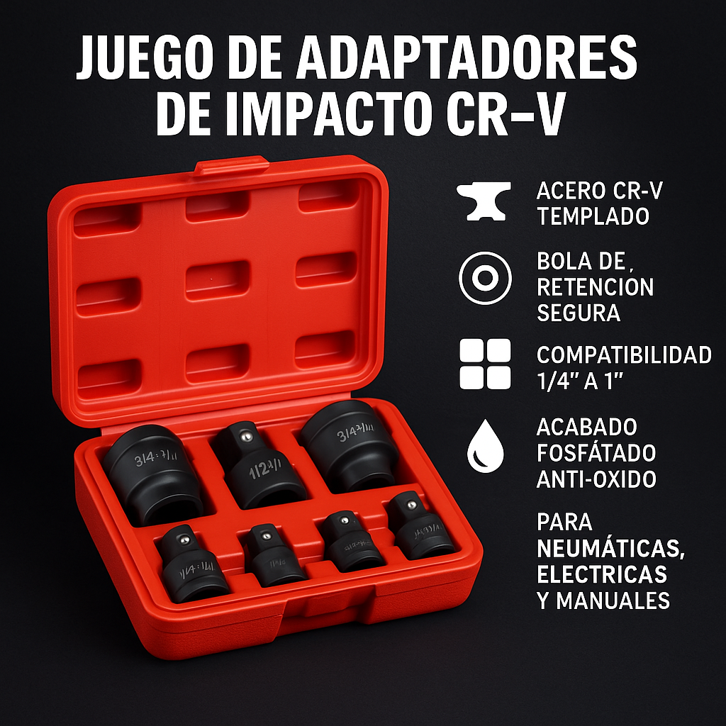 Sirve para convertir el encastre entre llaves/vasos de distinto tamaño (de 1/4" a 1"), sin perder fuerza. Con un solo set haces más trabajos y cambias de medida en segundos.