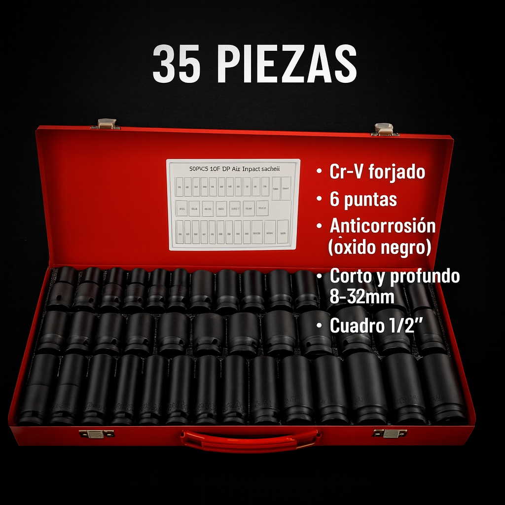Ajusta y afloja tuercas y pernos con un set profesional de 35 piezas fabricado en acero cromo-vanadio (Cr-V), forjado y tratado térmicamente. El acabado negro resiste la corrosión y su diseño de 6 puntas evita barridos bajo alto torque. Incluye dados cortos y largos para acceso estándar y profundo, organizados en estuche metálico.