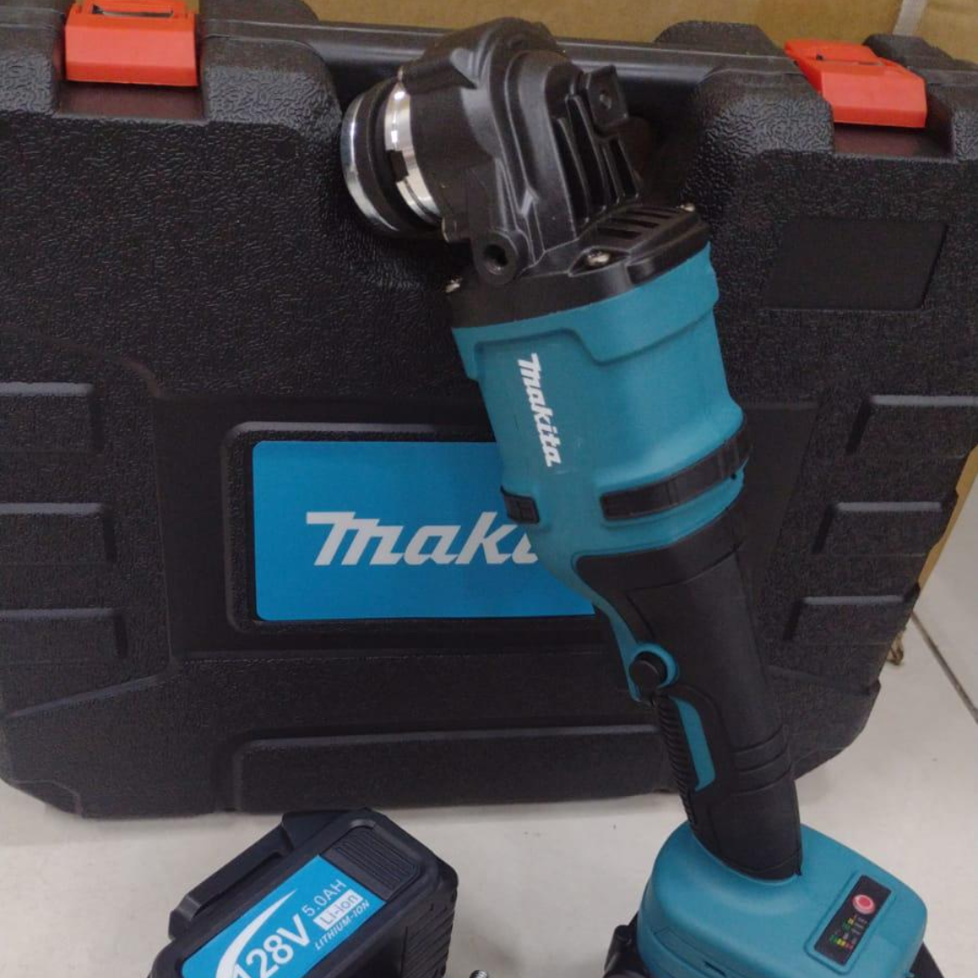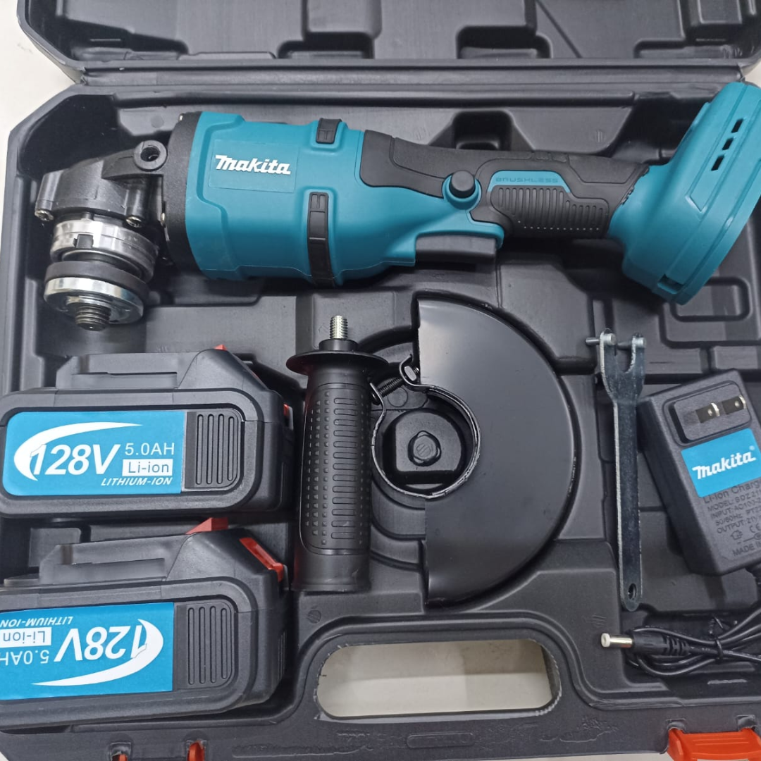 Viene completa y lista para trabajar: pulidora inalámbrica Makita 4", 2 baterías 128V 5.0Ah, cargador rápido, mango auxiliar, protector, llave y maletín rígido para transporte.